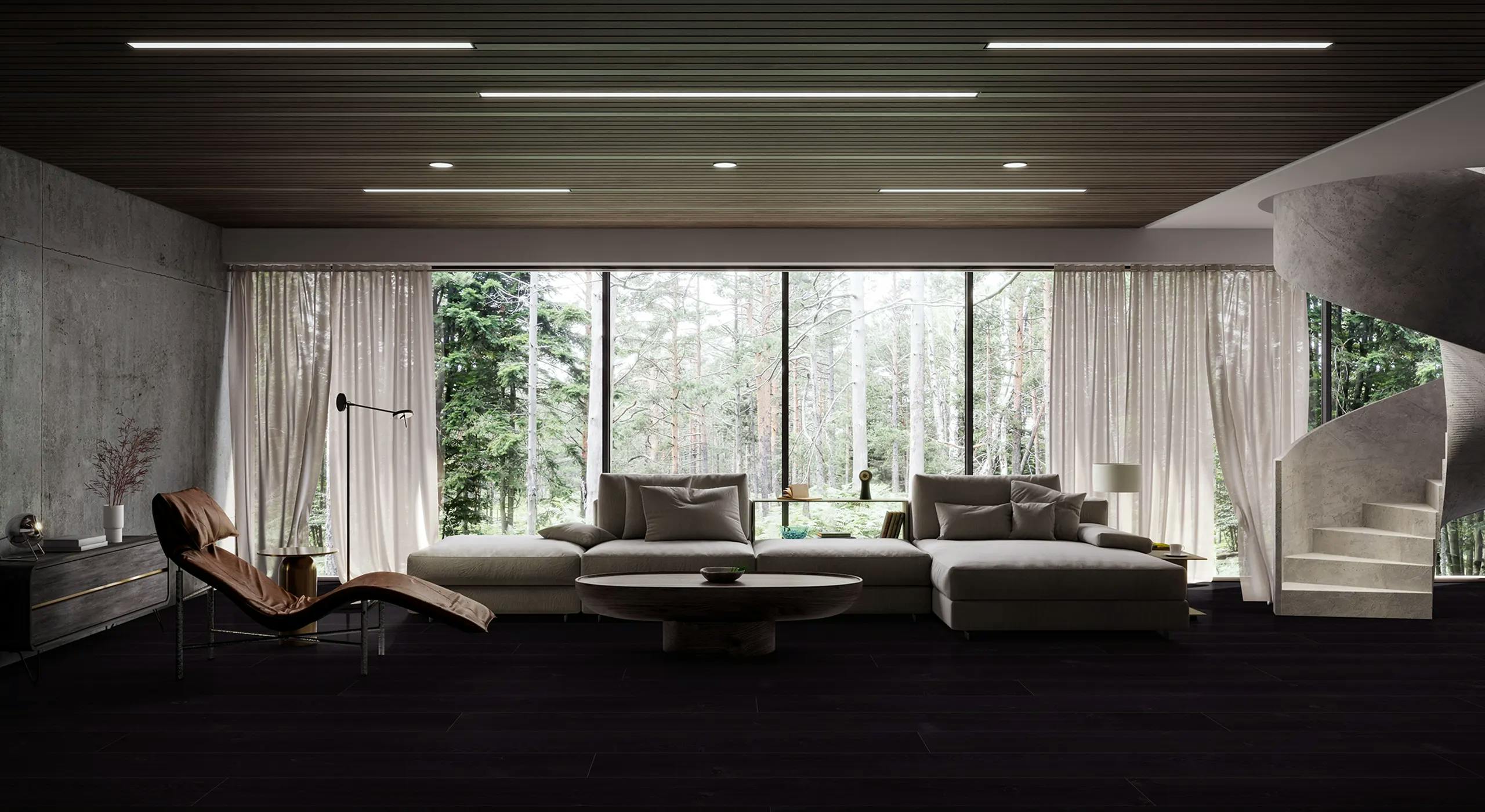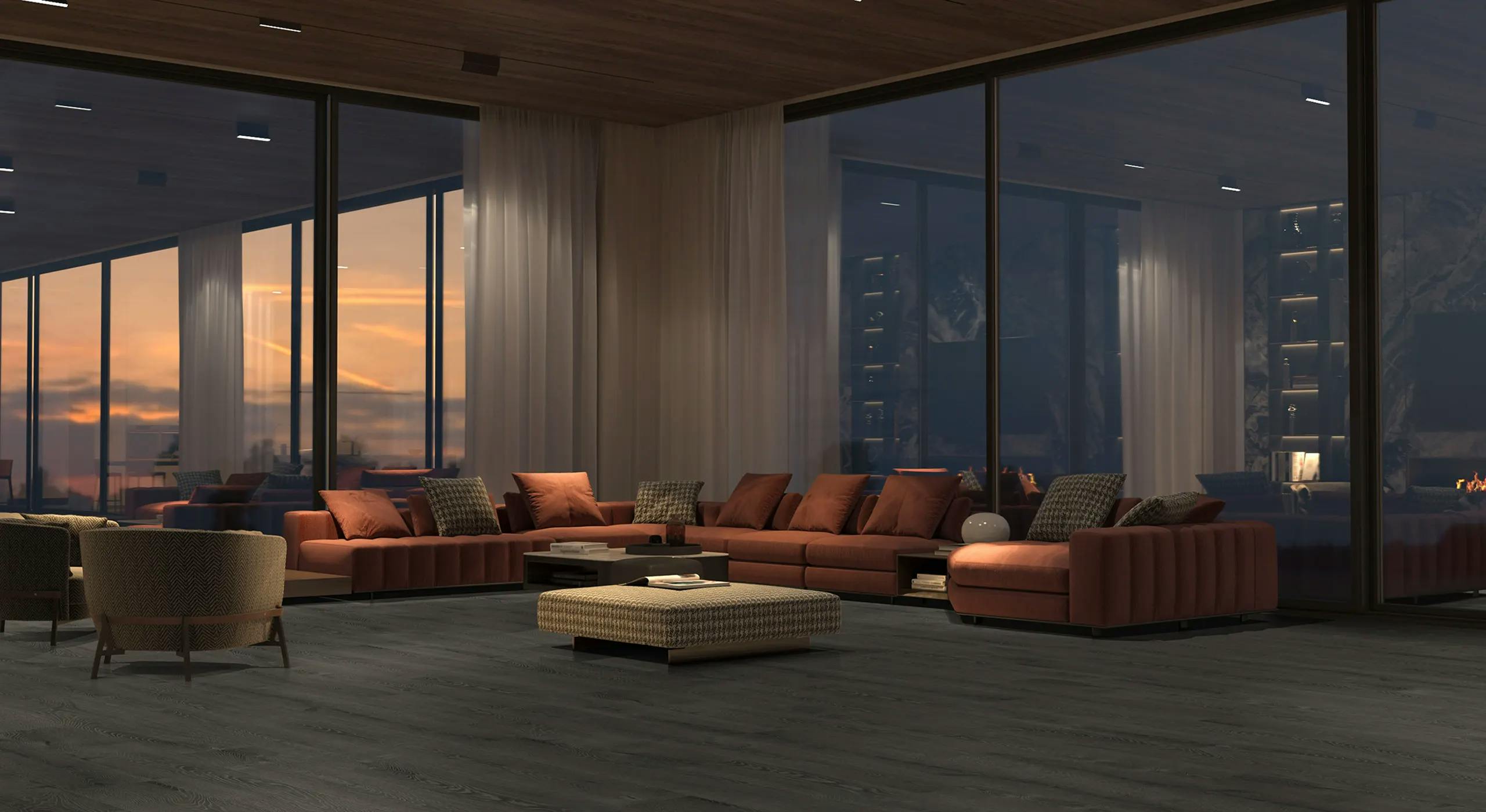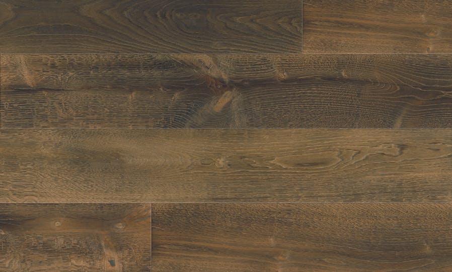 A rich brown informed by darkness in the grain. The color speaks to that special moment after a sunset when the sky begins to fade towards dusk. The blending of lights and darks is what makes this floor so unique.