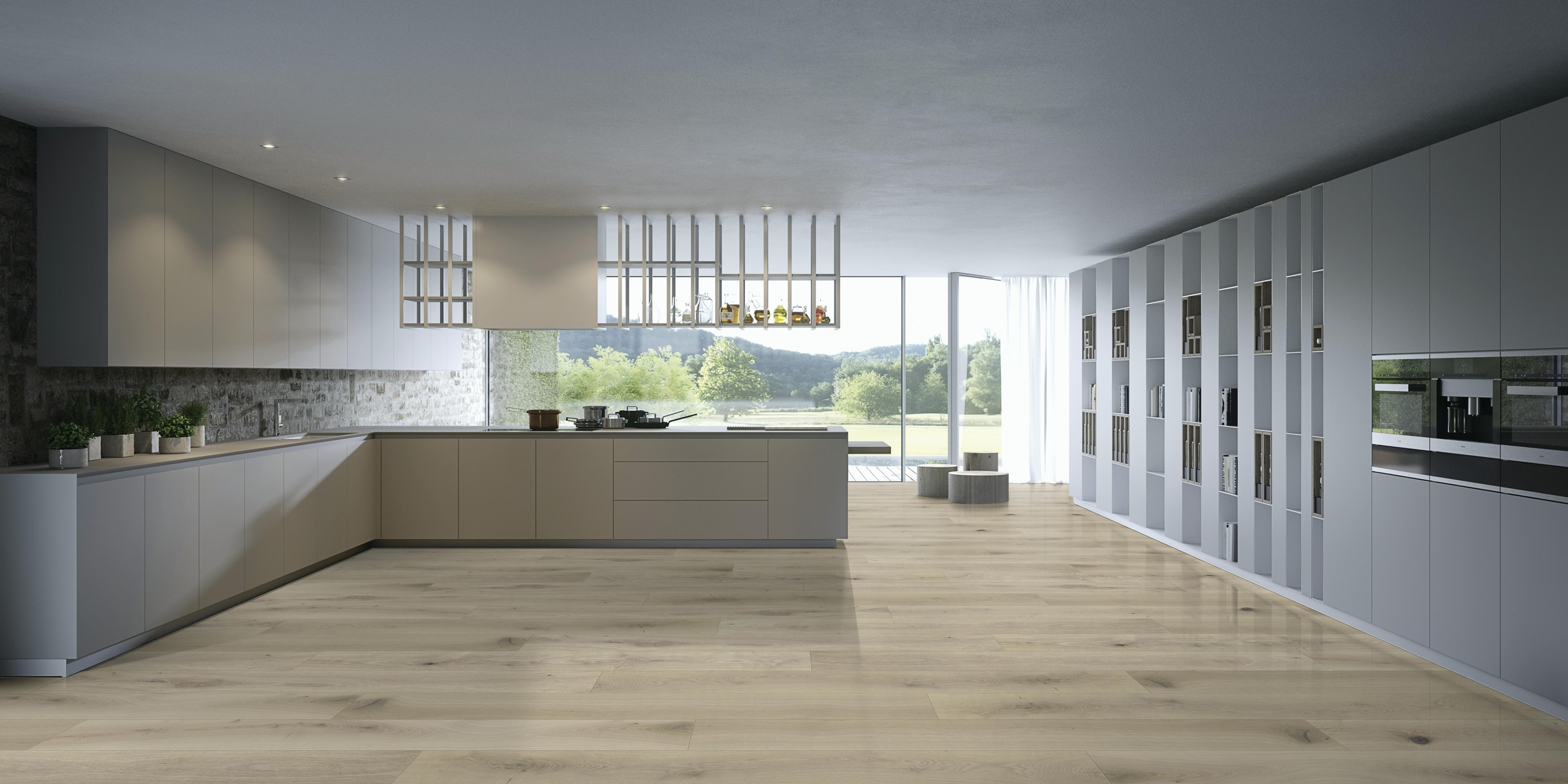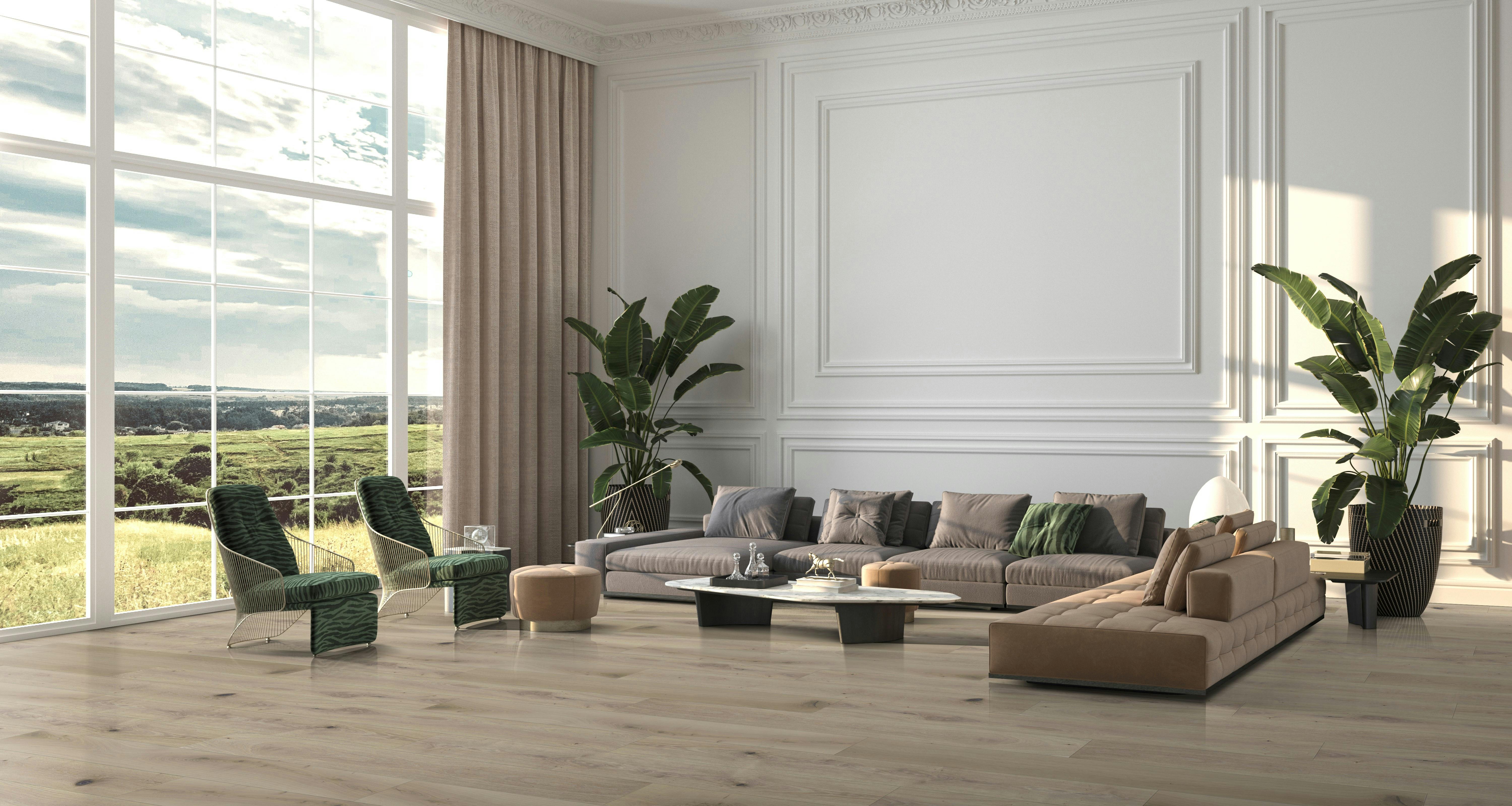 Global Winds planks are 7.5”/190mm wide, with lengths up to 75”. All are engineered European white oak floors, with an ultra-matte UV lacquer finish.