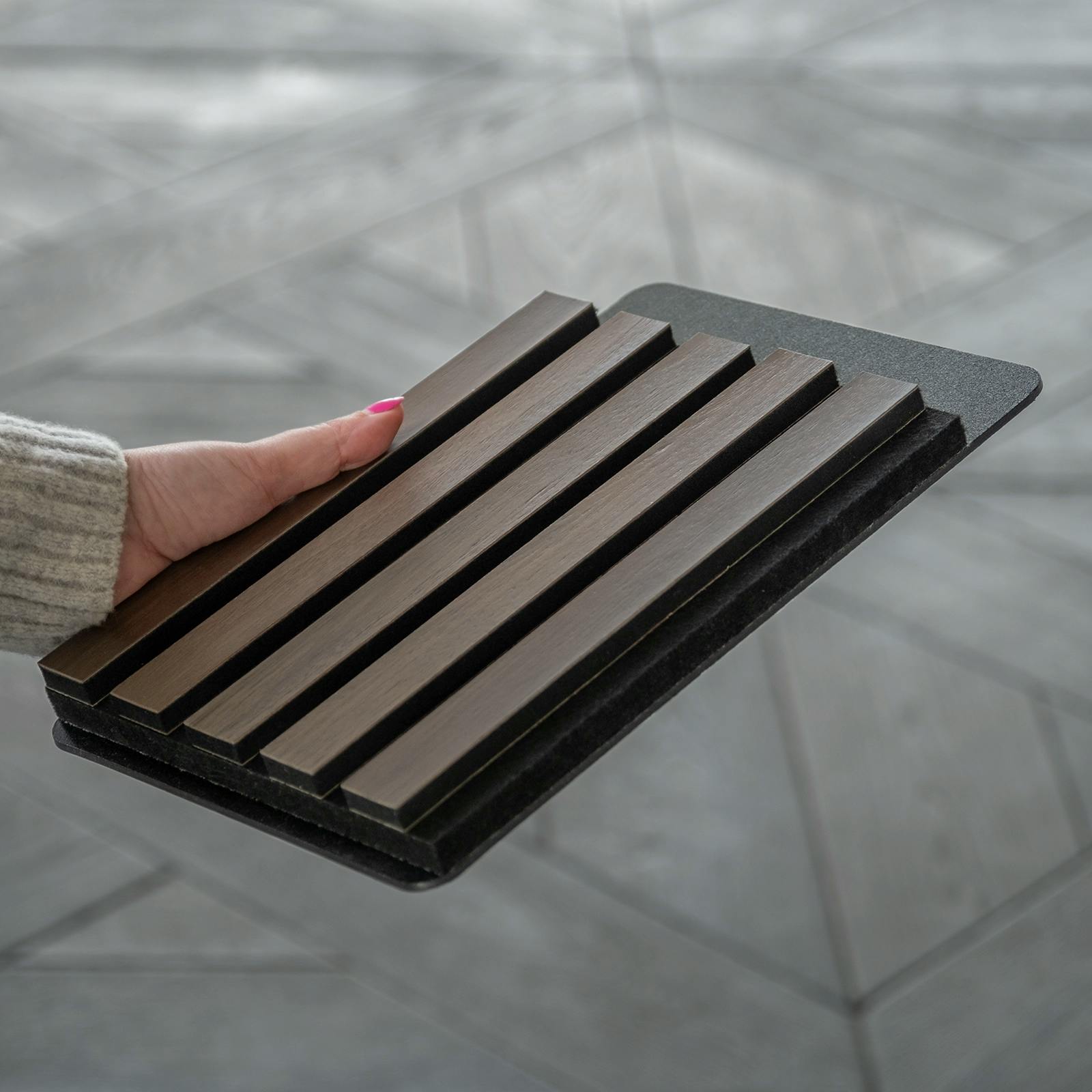 Lacquer finished veneer serves as a canvas for wood visuals in five colors. A felt backing insulates sound and deepens the contrast in its visual impact.