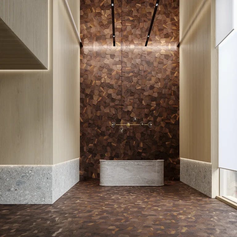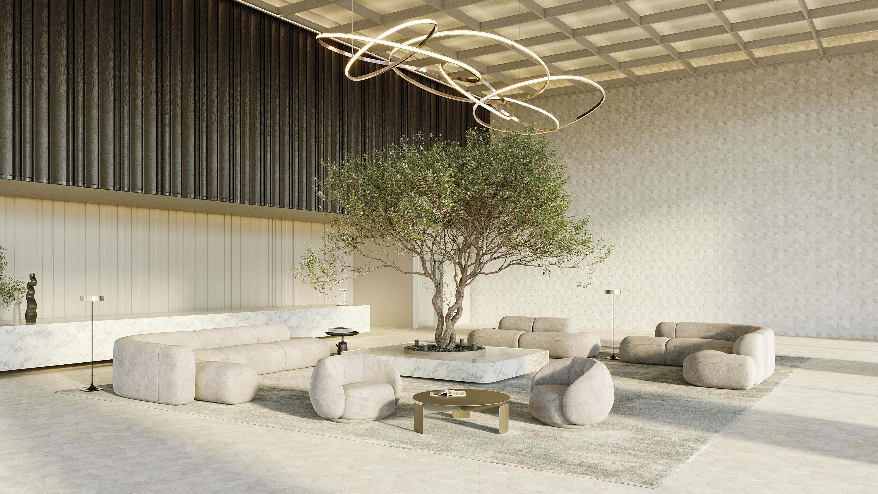 Each shaped of the Forma design resembles an imperfect pebble. When composed, the organic irregularity expresses an effect at scale like a mosaic.