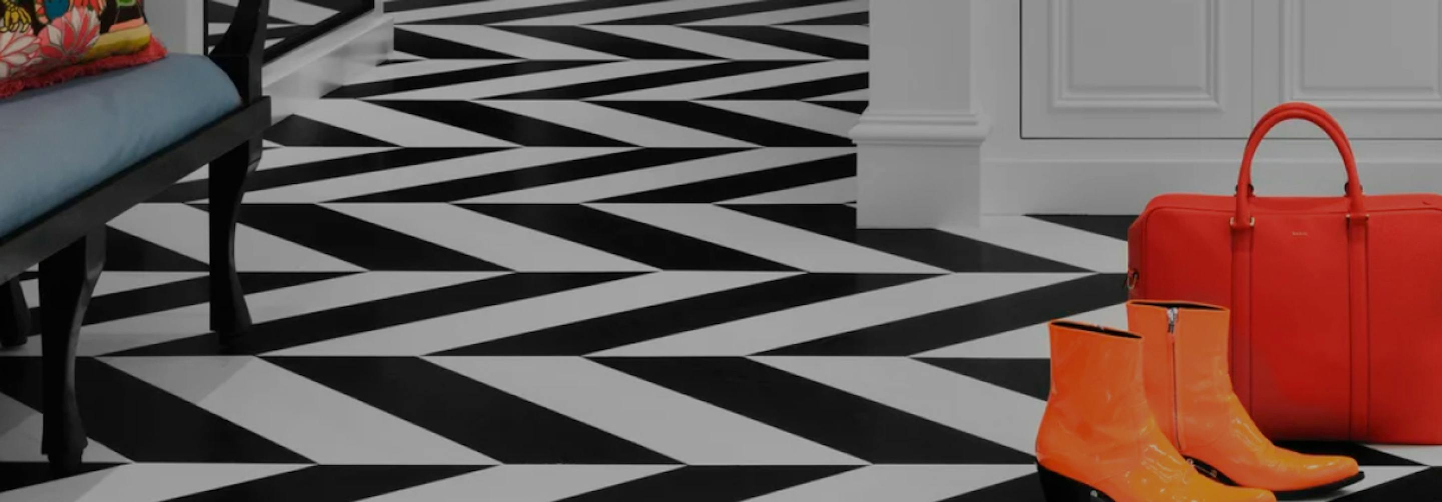 Flat and dimensional patterns interlock, expressing continuous visuals across the floor and wall.
